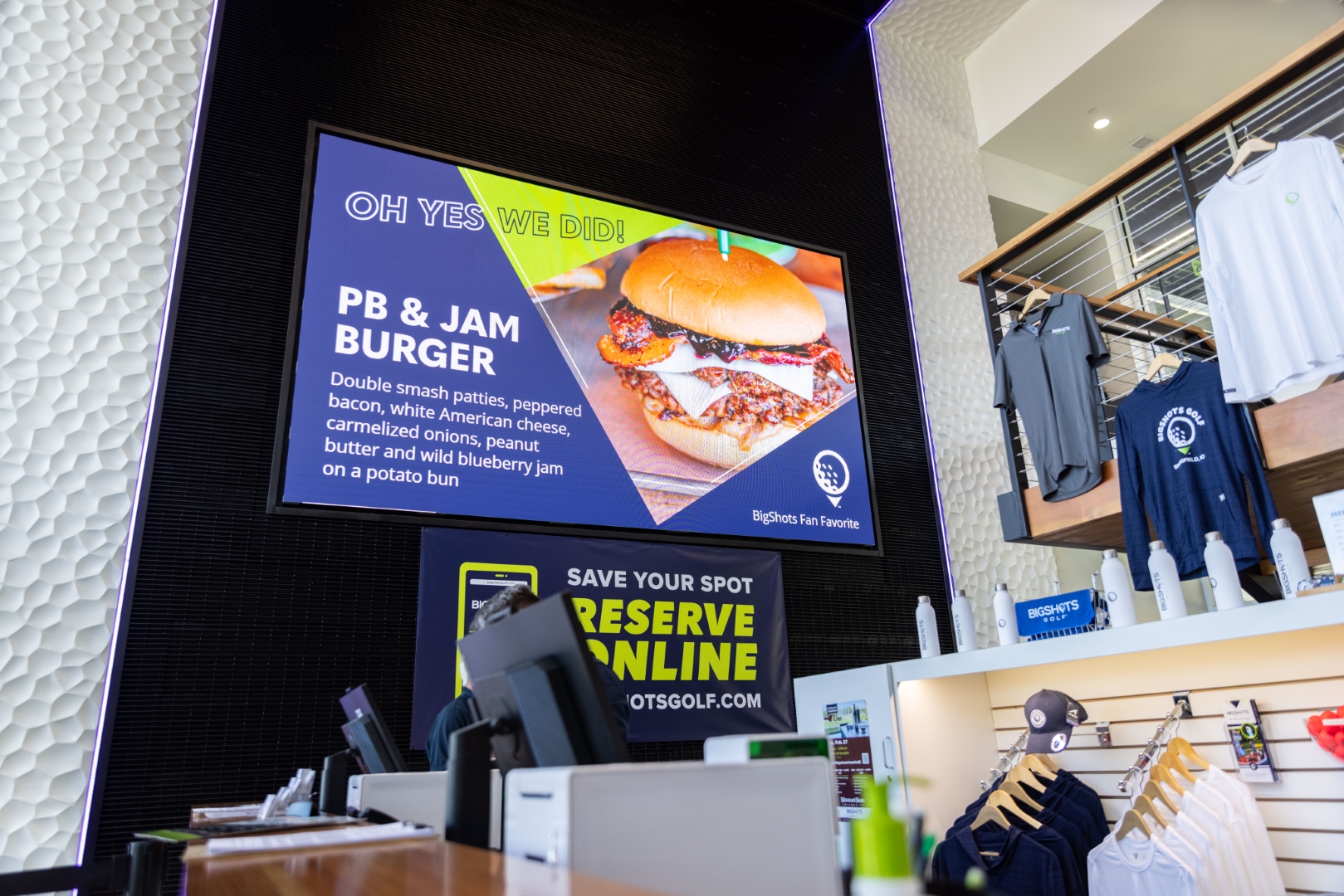 Big Shots Administration & Marketing teams are able to remotely control their Visiontech video wall systems at both the Springfield, Missouri and Fort Worth, Texas locations from their corporate offices via encrypted TCP/IP network control; this allows them to deploy location-specific content at a moment’s notice from the comfort of their offices, thousands of miles away.